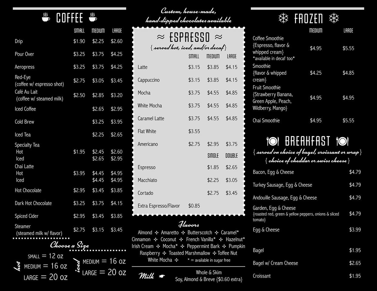 In addition to our high-quality coffee, we also offer a wide selection of specialty teas, breakfast sandwiches, baked goods and pastries, house made chocolates (and whipped cream!), and a heaping handful of small-town charm.
